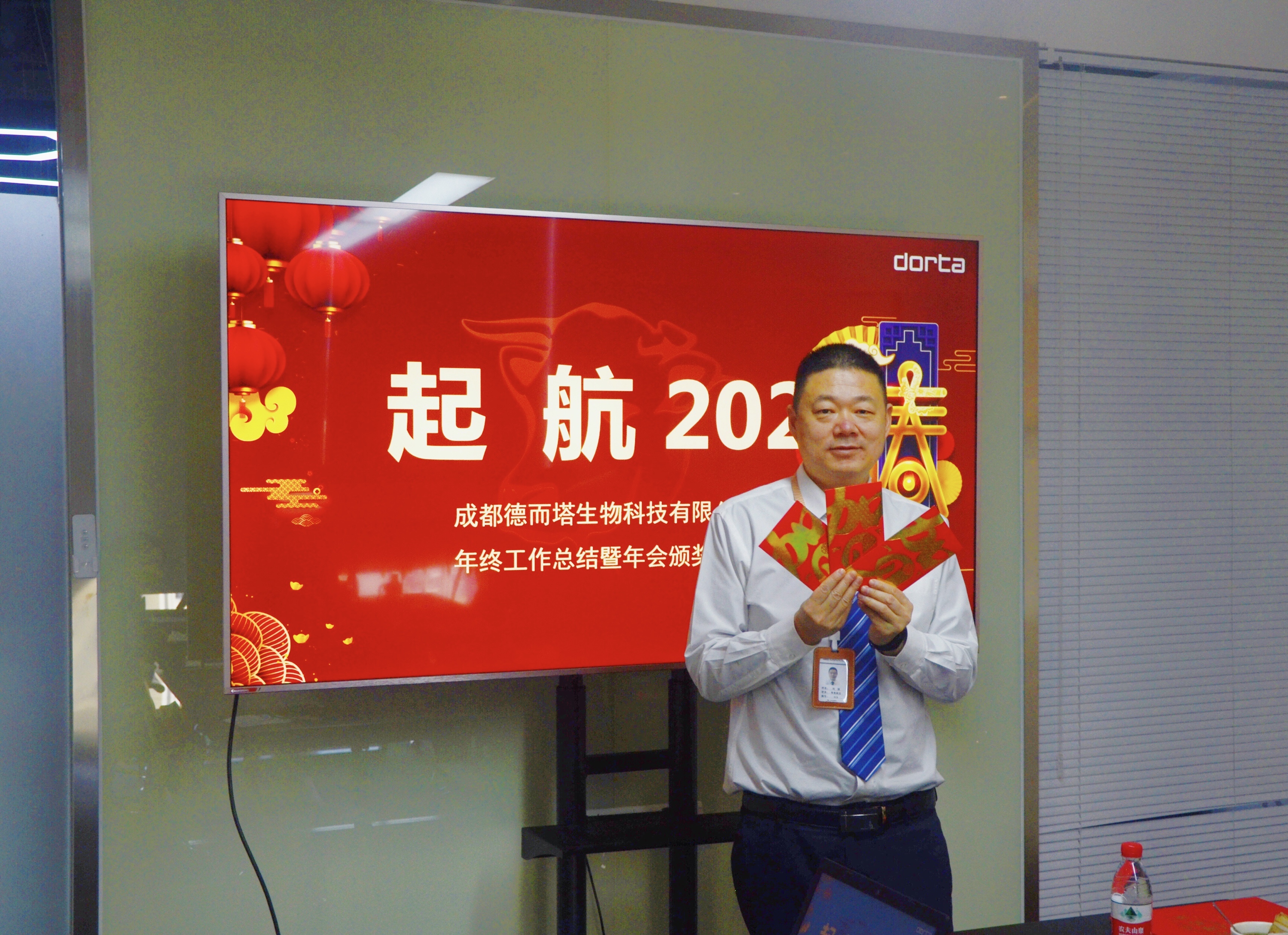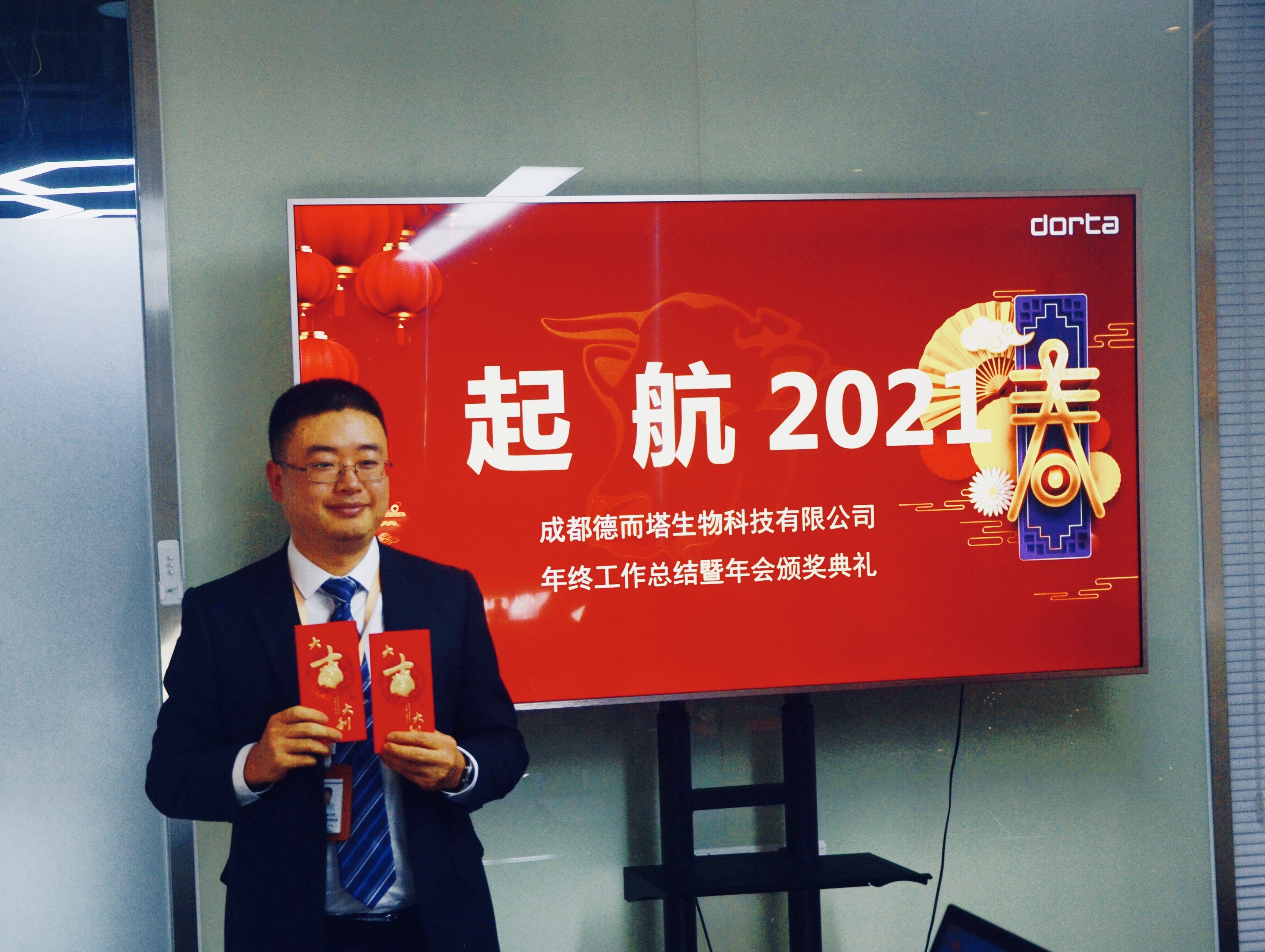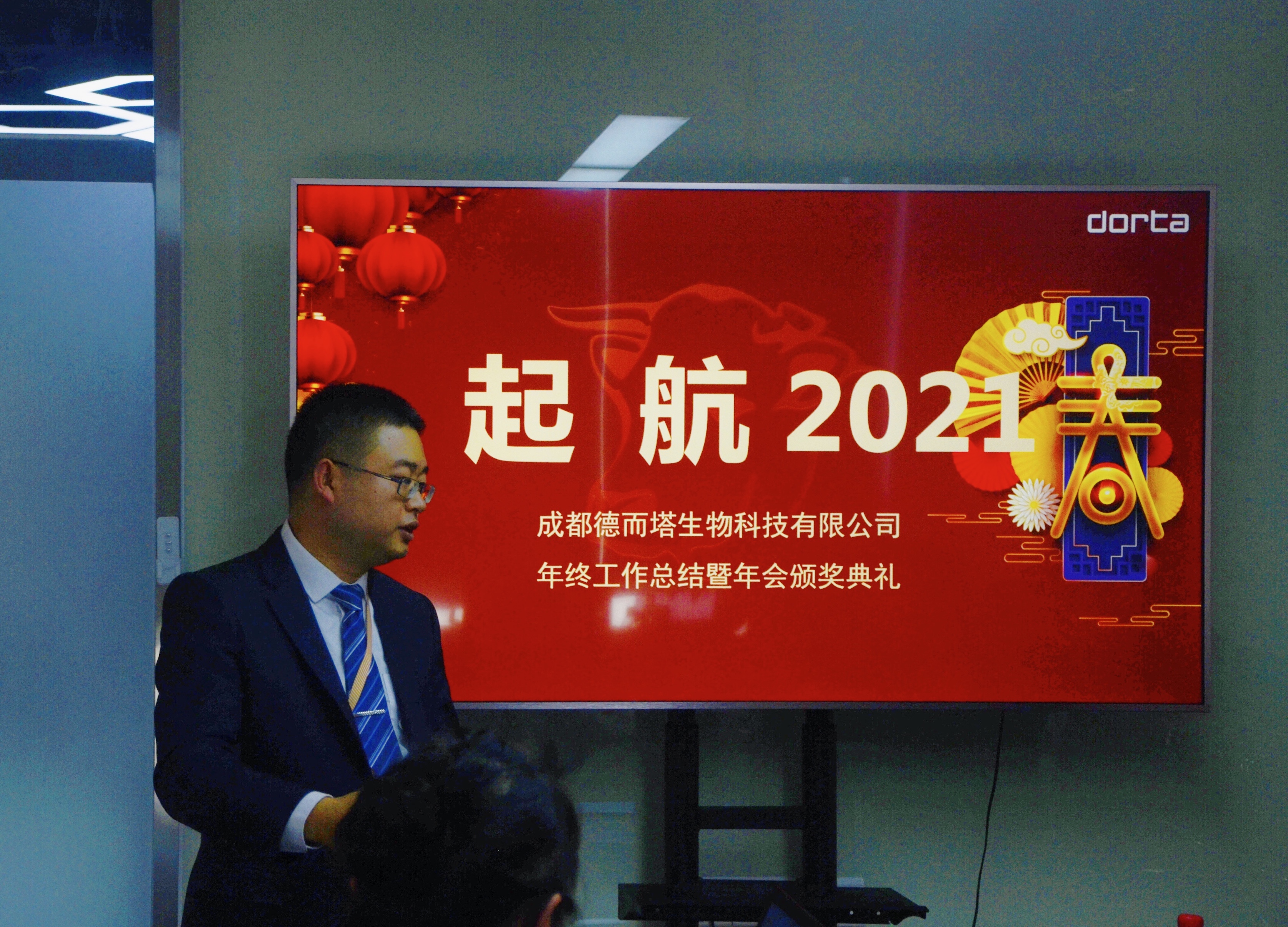 首先公司董事长王俊先生向大家致以了新年的美好祝福!并和我们一起回顾了刚刚过去的2020年-德而塔元年,作为一家2016年的初创企业,历经了近四年的投入,产品研发、临床实验,终于在2020年1月7日取得了第一个产品UC7020的生产许可,作为一个新品牌、新产品,刚刚面世就遭遇了新冠疫情的巨大影响,尽管如此,我们依然砥砺前行、逆势而上,在大家共同的努力下,公司取得了自成立以来最好的业绩!