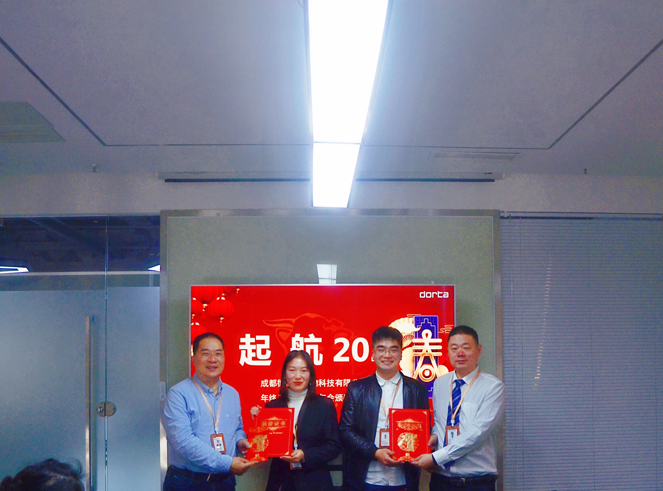 董事长王俊、总经理何强代表公司为2020年优秀员工和优秀销售人员颁发了奖状和奖金。