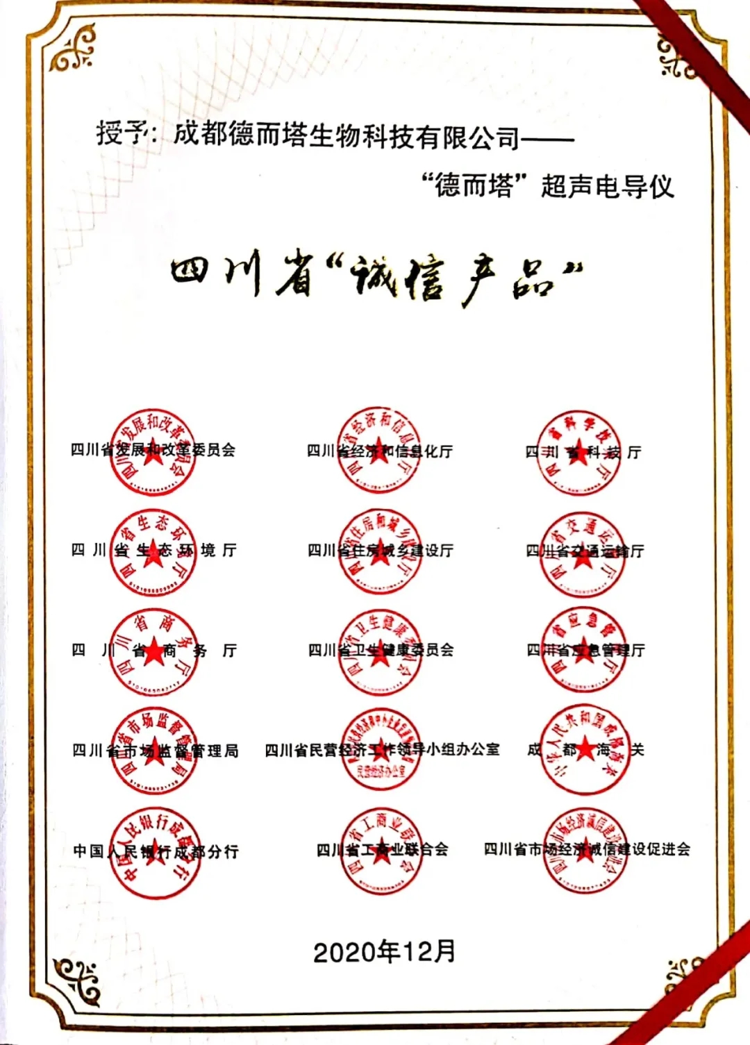 ——德而塔超声电导仪荣获四川省“诚信产品”